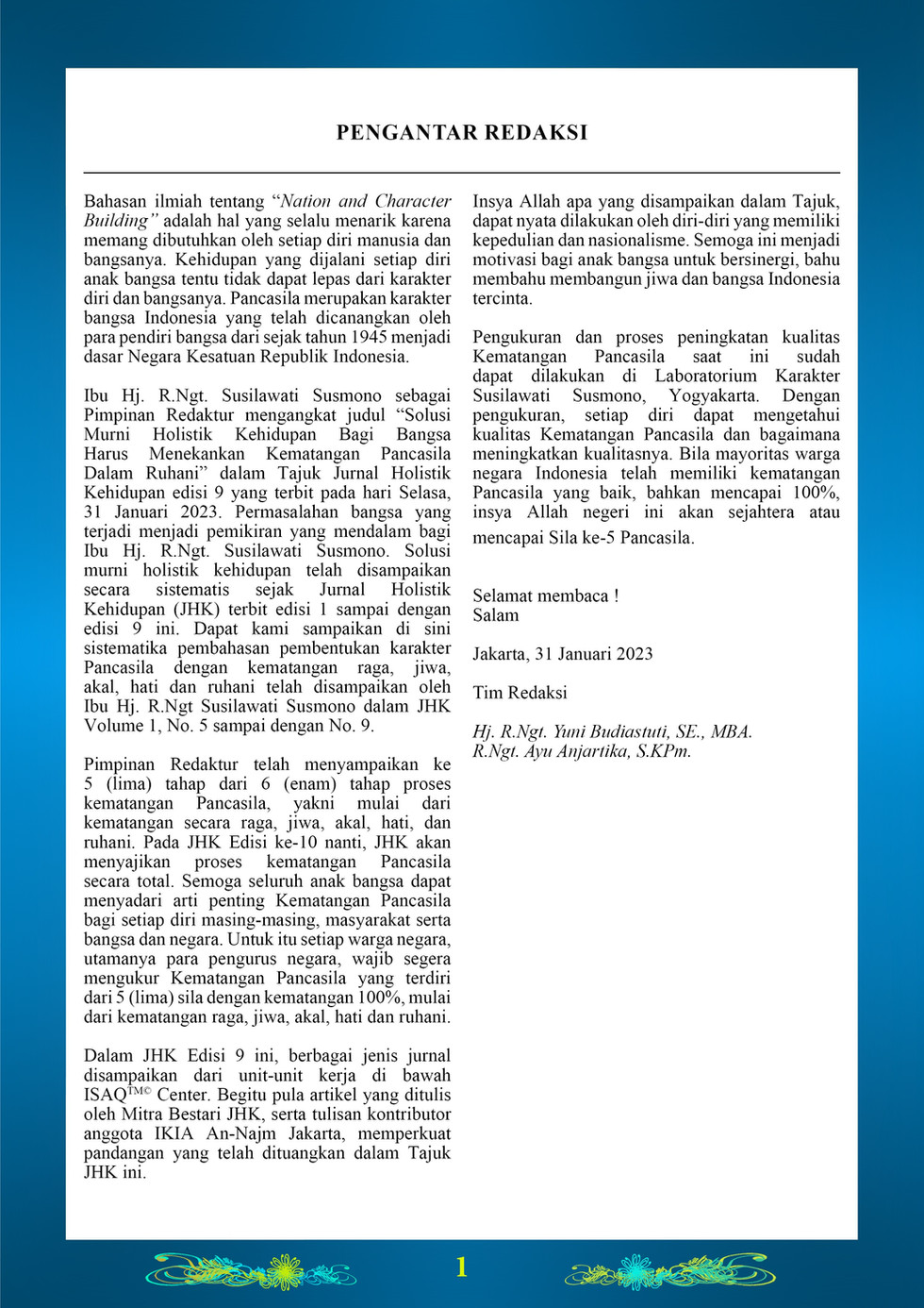 Tajuk Jurnal Holistik Kehidupan (JHK) Vol.1/ No.9/31/01/2023, kami beri tema “Solusi Murni Holistik Kehidupan Bagi Bangsa Harus Menekankan Kematangan Pancasila Dalam Ruhani”, merupakan lanjutan JHK Edisi sebelumnya Vol. 1/No.8/31/10/2022 yang menekankan kematangan Pancasila dalam hati.